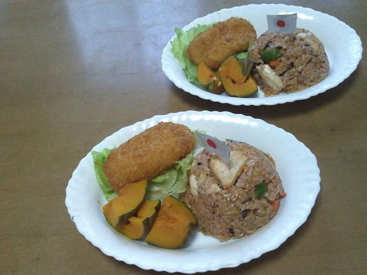 自分で作ったのは、チキンライスとレンチンしたカボチャだけ。