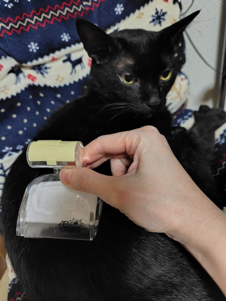 ノミの死骸が落ちていたりフンを見なくなったり、私が新しく刺されることがほぼ無くなったため、ちょっとは駆除の効果があったのだと信じたいですが、たまにノミ取りブラシに引っ掛かるノミが。
