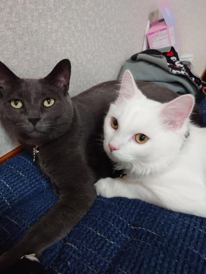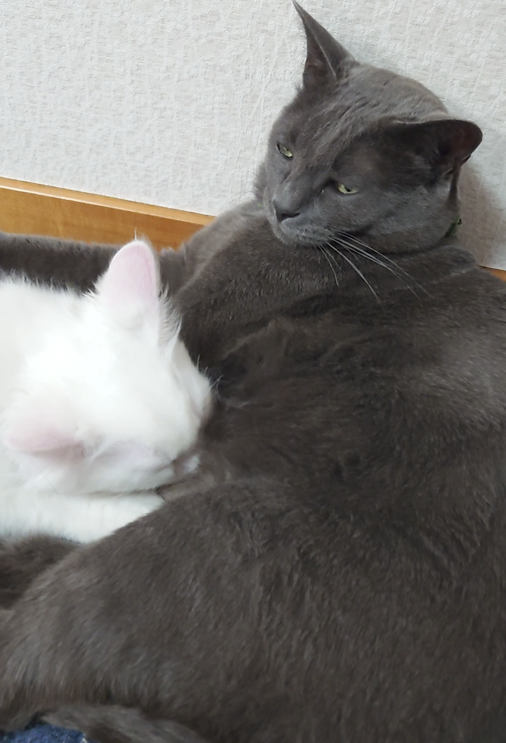 ココで出会ったロシアンブルー風のグレーカラーのジル君♂とネコLIFEを楽しんでいます! 事務所と住居で常に一緒です。 R6年4月〜ミヌエットのプッチが仲間入りしました〜!
