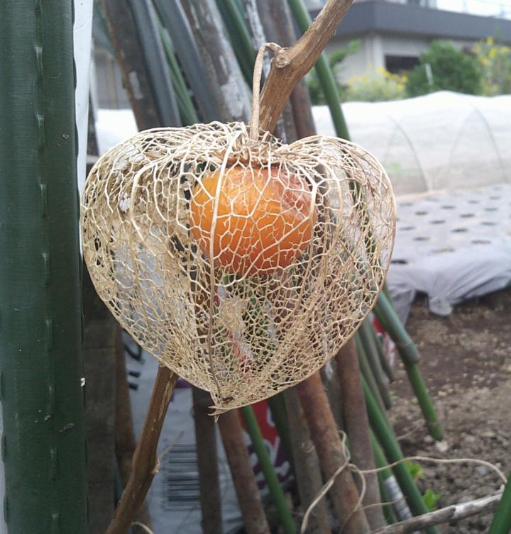 ほうずきの赤い傘部分が枯れて筋だけになってました。