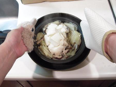 ナナをのけた後、白菜/きのこ盛り合わせ/豆腐をタジン鍋におもむろに突っ込み、火にかけること15分。