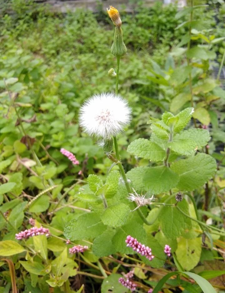 手前のピンクの花はイヌタデ、ライムグリーンの丸い葉っぱはマルバ