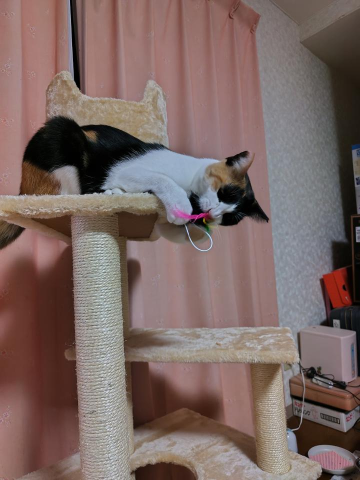 新しい子を迎えるために、トライアル中で、みーこちゃんは2階に避難生活?が続いてて、ストレス解消のために、二階にもキャットタワーを設置。