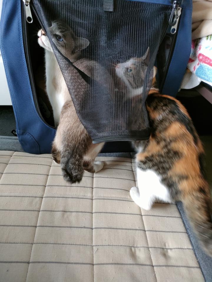 引っ越し当日が心配でたまらないおかーしゃんです。洗濯ネットに入れゲージに入れ