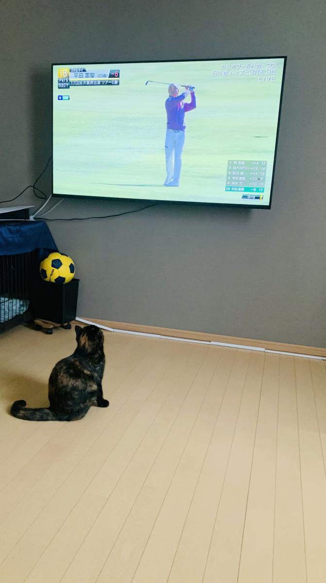 ずっとボールの動きを見てテレビの中も狙ってます。