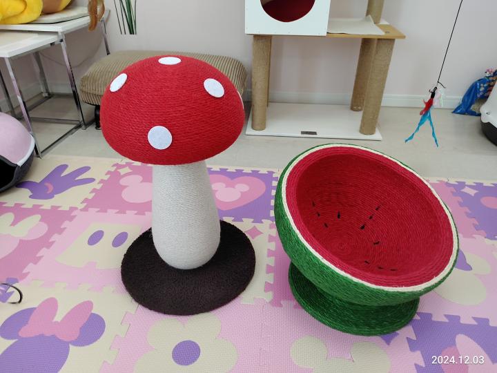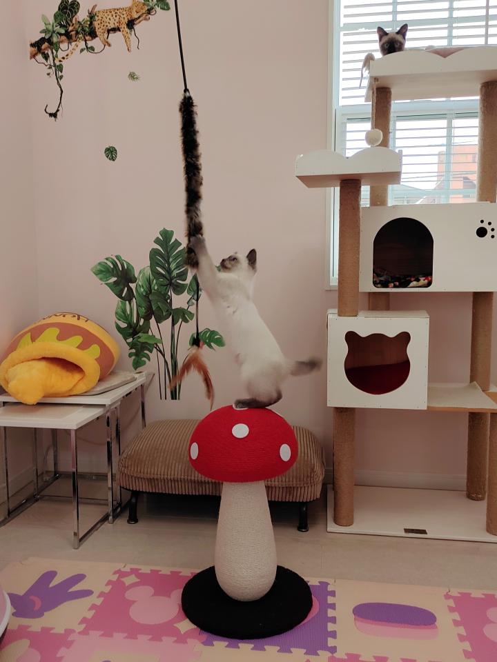 中央にド〜ンとおいても無反応なので猫じゃらしを吊るして誘ってみました😊