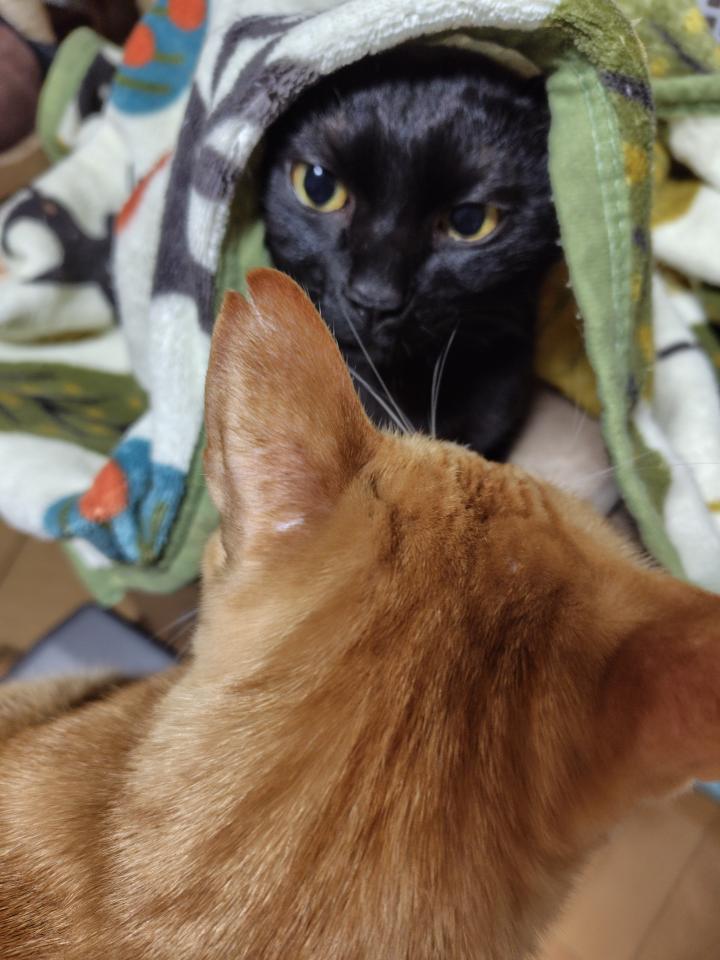 お布団やブランケットに包まって寝るのが好きなげんさんですが、のんたにはそれが不思議なようです。