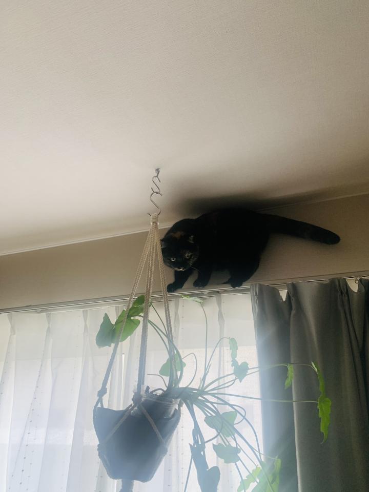 今日は細いカーテンレール上を進み、植物をいじって遊びました。