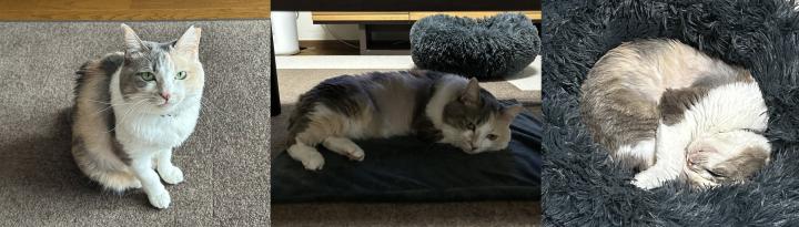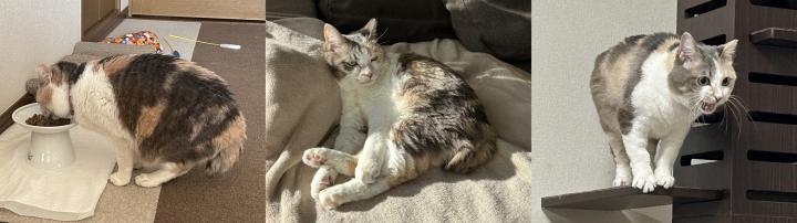 朝ご飯を食べたり、ひなたぼっこしたり、ソファーに跳んだり。