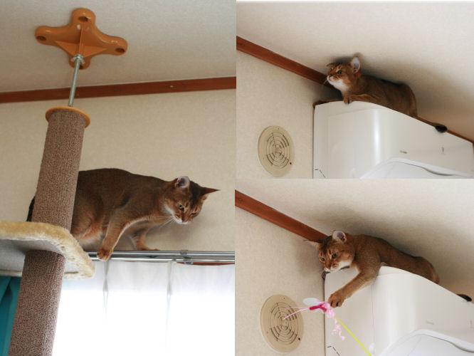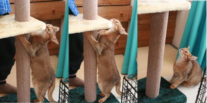 ジャーンプ!」と手でルート案内をして、柱でガリガリ爪を立て