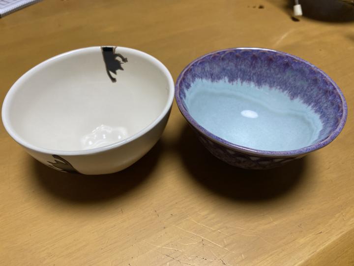 ご飯茶碗は普段から使って居る物が有るのですが、益子焼の茶碗と黒猫の絵の茶碗を購入