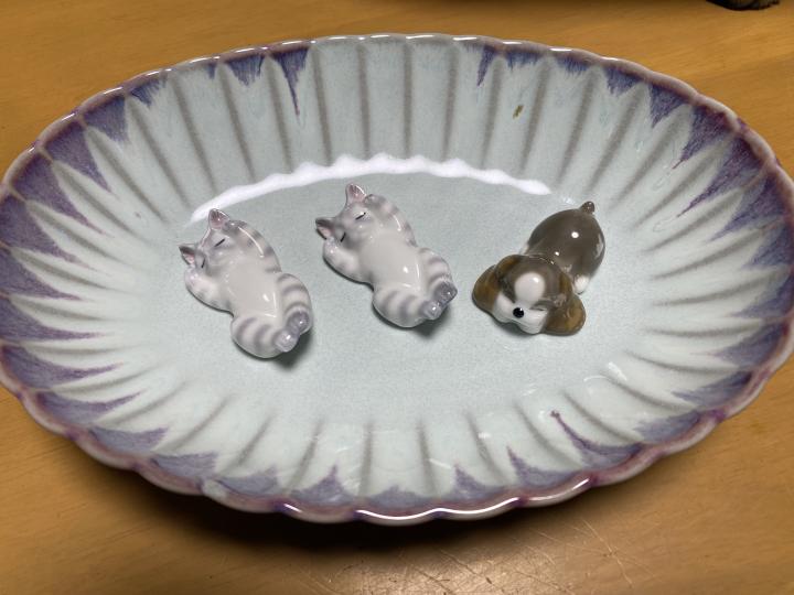 益子焼の茶碗と同じお店で購入した楕円形のお皿、お皿の上に居るのは、他のお店で3個1,000円だった猫と犬の箸置き