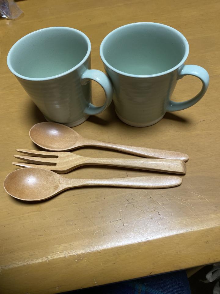 今回のお目当てのマグカップと木製の軽くて手に馴染むカトラリー、スプーンは握力の弱くなって来た母用、フォークは私のお弁当用に購入3本で1,100円でした