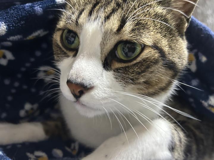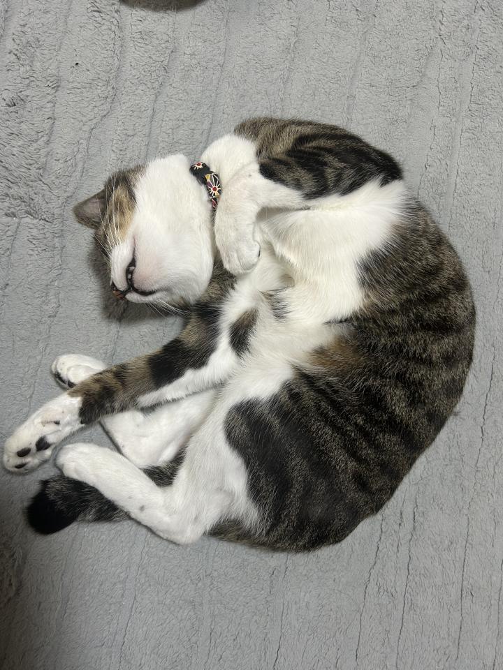 約5.5キロの大きめな体、お腹と胸と手足が真っ白、目が緑で鼻は茶色、しっぽは長く鍵しっぽ、肉球は黒色の去勢済みのオス猫です。