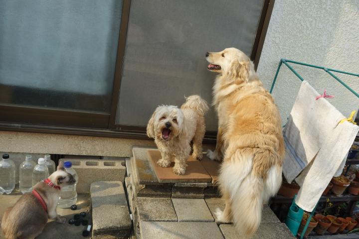 散歩から帰ってきて、ご飯を食べて、ニャンコたちの爪を切って、庭に出たら 丁度♂が帰ってきて・・・(._.)