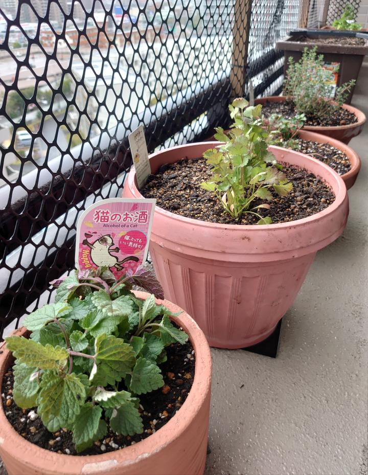 昨年までベランダでバジルだけ育ててましたが、今年はバジル以外にミントやパクチー、イタリアンパセリ、大葉、そしてキャットニップを鉢植えしました。