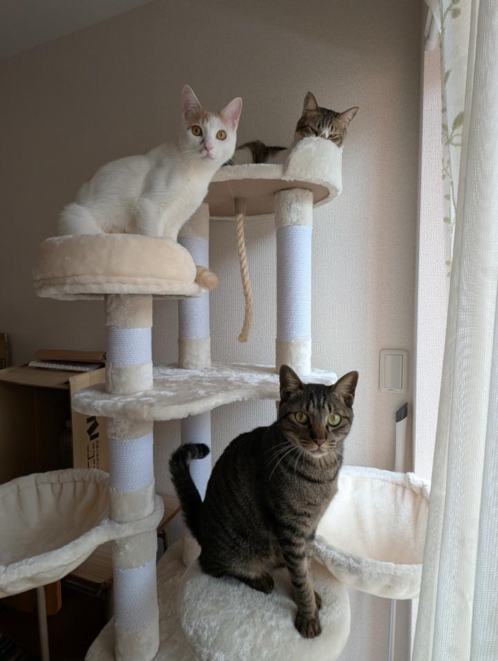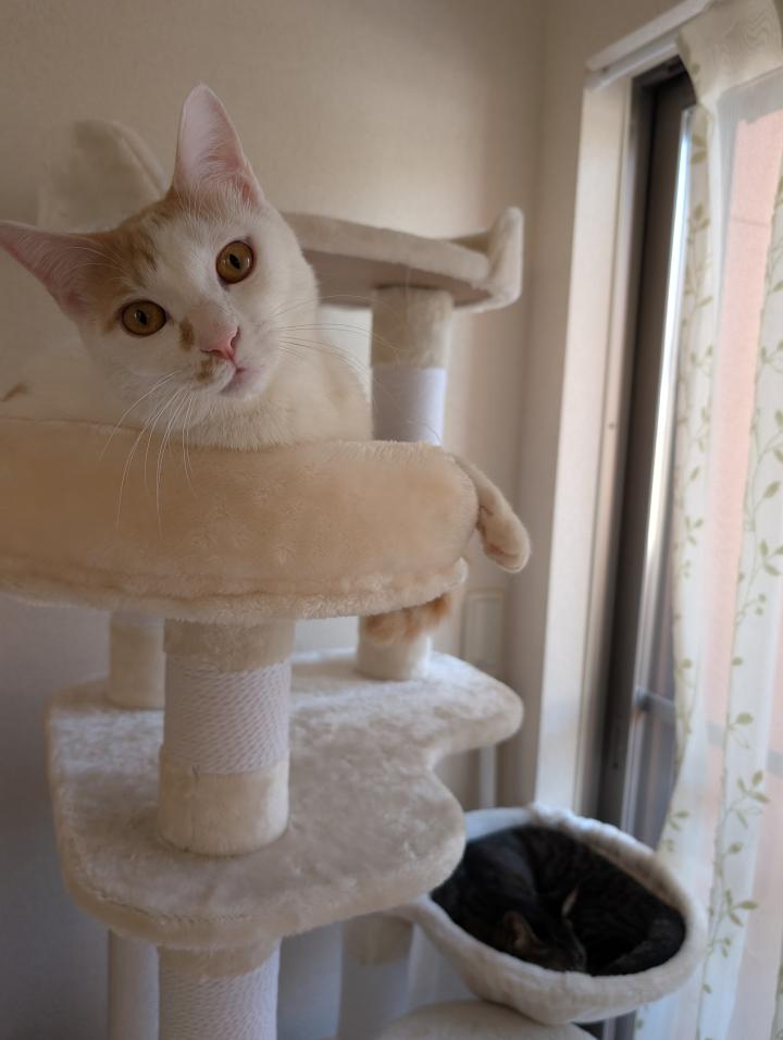 新たに設置したキャットタワーも慣れて遊び場&お昼寝場になっています♪