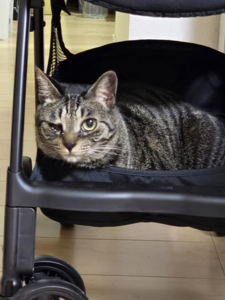 真っ先にゆずがベビーカーの下に乗ってしまいました。