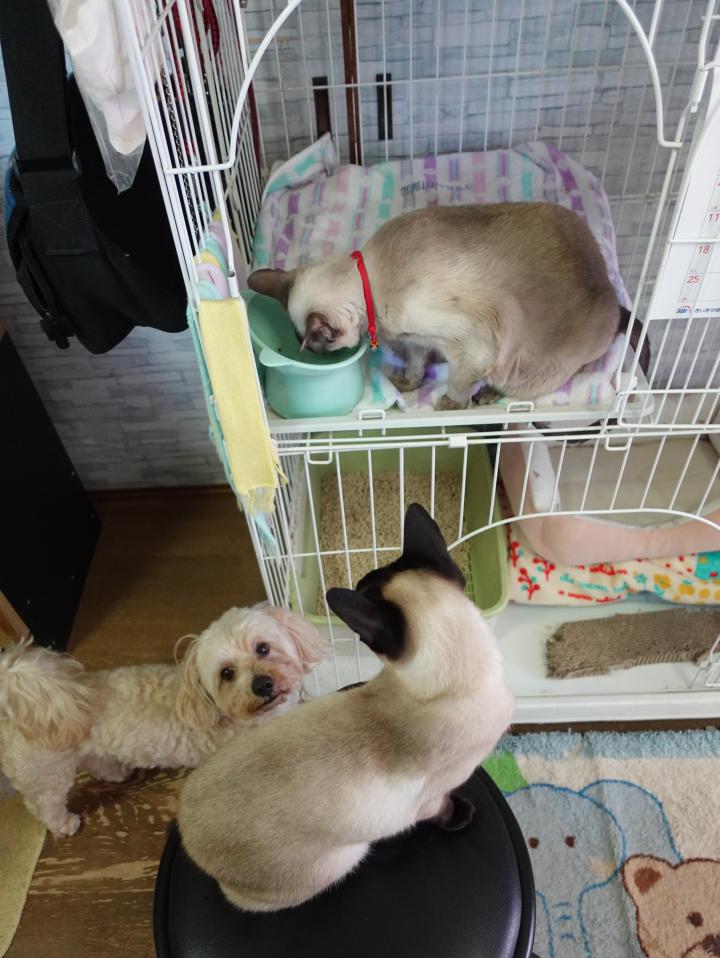 福ちゃん😼「ポニョ😻は 食べ終わって、あたしが残した3つぶ食べてるだけなのよ~(≧▽≦)」