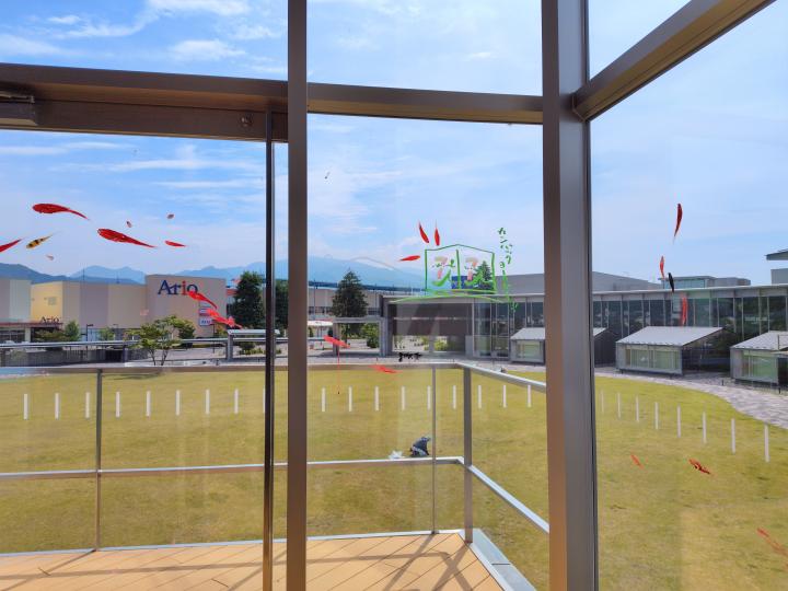 会場の通路の窓には深堀さんが描かれた金魚たちが展示室まで来場者を誘うように描かれていました!