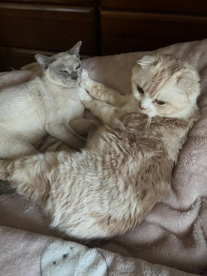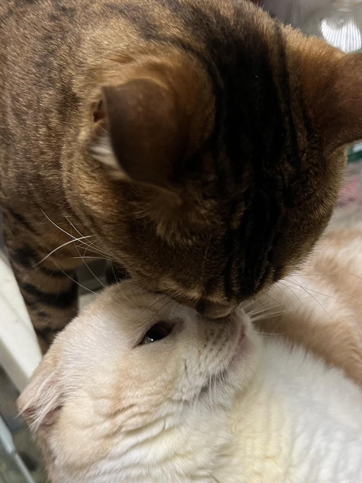 アイちゃんがしつこくシャミをペロペロしてたら、シャミがグイッと押し返してましたー。