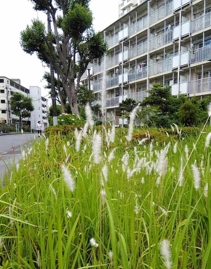 通りは閑散としてすがすがしいです。チガヤの生える草むらは団地