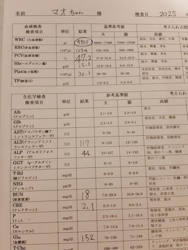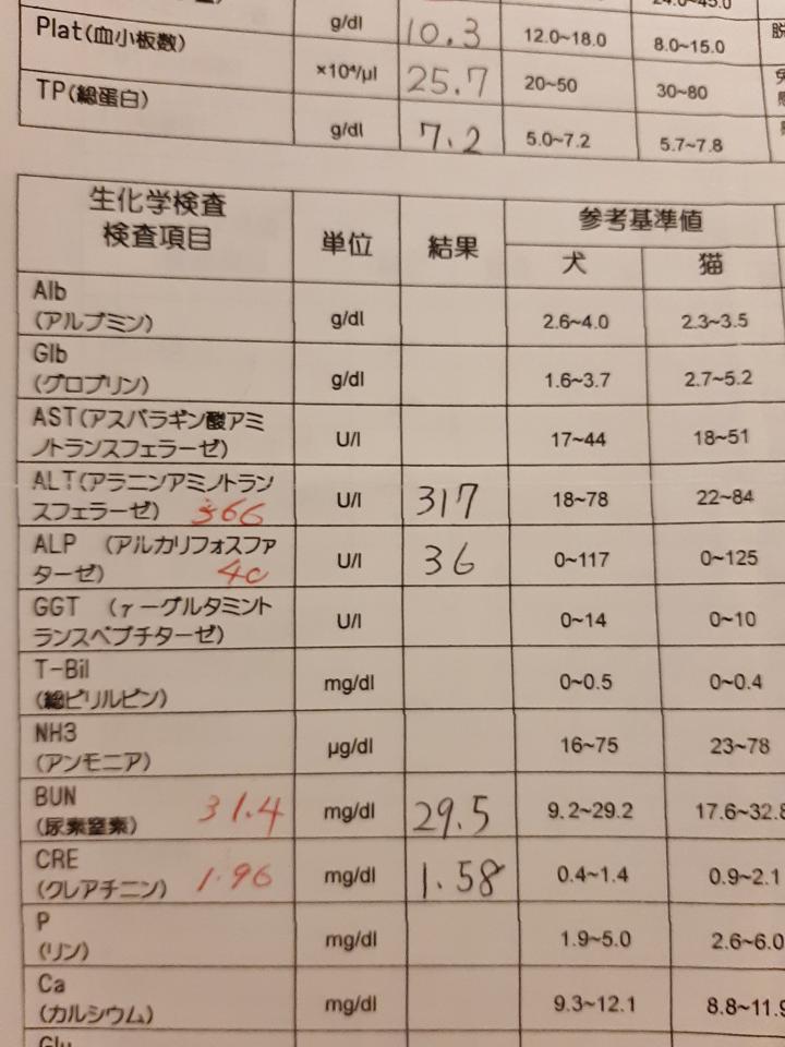 肝機能(ALT)が300越えと高く、すぐに療法食にきりかえたほうがいい状態でした。