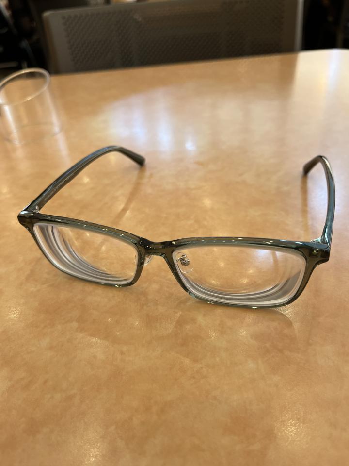 ダークグリーンのフチの四角っぽいのをチョイス。今までのは、ブラウン系だったから気分転換。7700円なり。安っ!