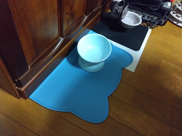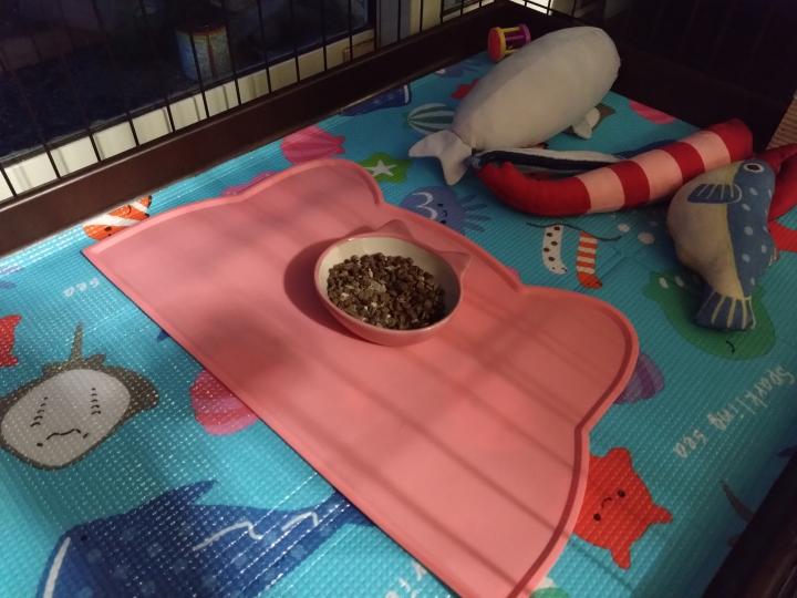 平皿はこぼす高杯型だと皿をひっくり返すわで困り果ててましたがシリコン製ランチョンマットを使用することで食べ散らかしても、こぼしたフードがお留守番ゲージ内に広がらなくて済むようになり…