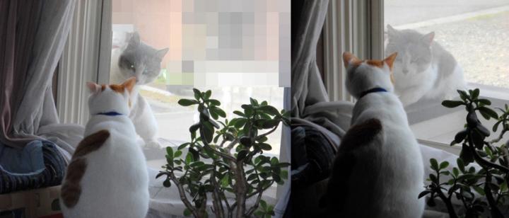 私が外出の準備をしていると、窓に向かって「ニャ~、ニャ~」鳴いているちびがいました。