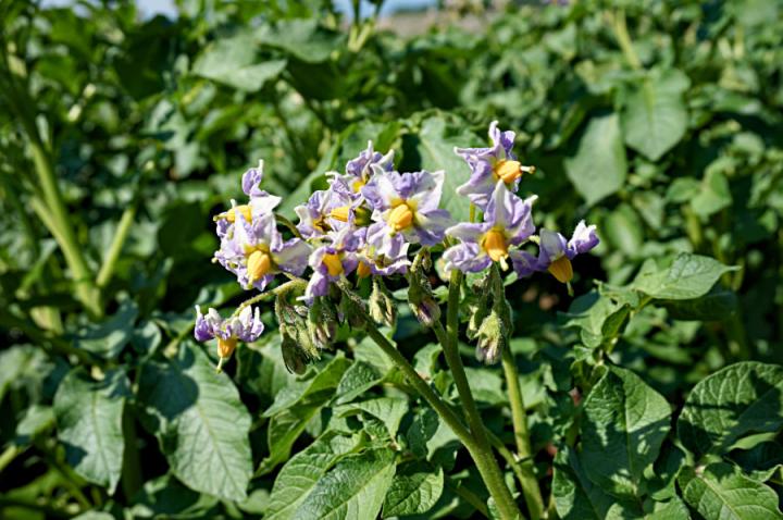 一般的な男爵芋とか澱粉やポテトチップス用の品種とかは白い花ですが、メークインは薄紫です。