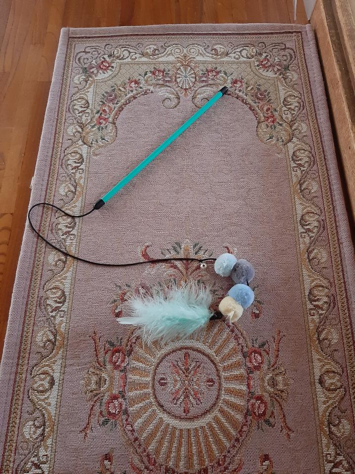 最近ずっと 朝起きると部屋の前やベッド横に 猫用おもちゃがポトリと置いてあります。