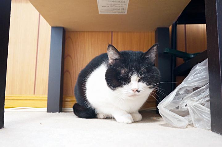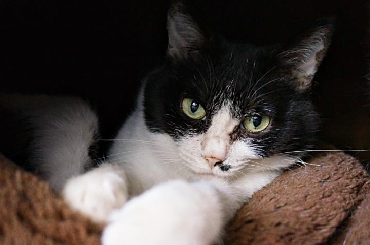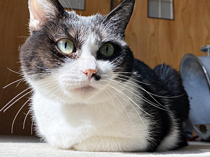 自然光の中の撮影、チョビのバックが暗くなっている割には本にゃんはきちんと目の色も写っていて良い感じに。