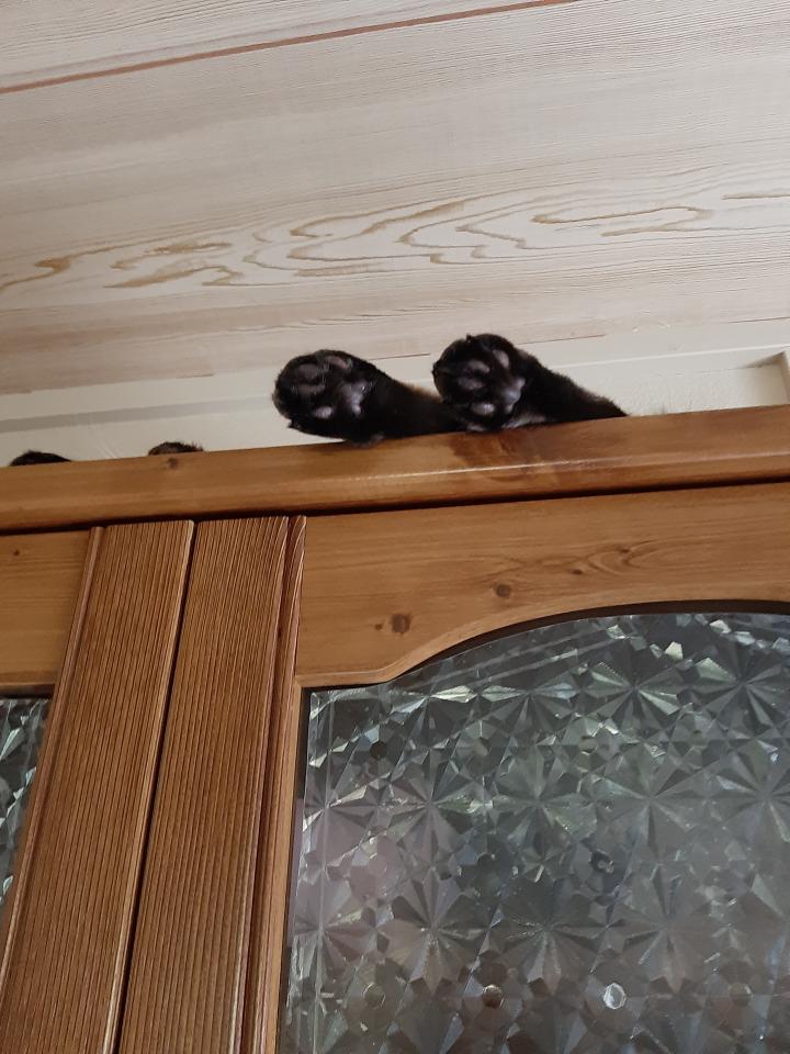 キャットタワーを登ってカーテンレールを歩き、この棚の上に到着。