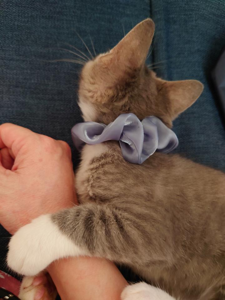 この体のサイズで鈴の音がないと、どこにいるか分からないので(お迎えした翌日の朝家の中探し回ったw)、もう少し大きくなるまでは、首輪をしておこうかな…?