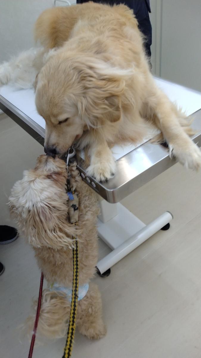 診察台に両手をのせた大五郎🐶「ぴみちゃん🐶、大丈夫だったか?頑張ったな(*^-^*)」
