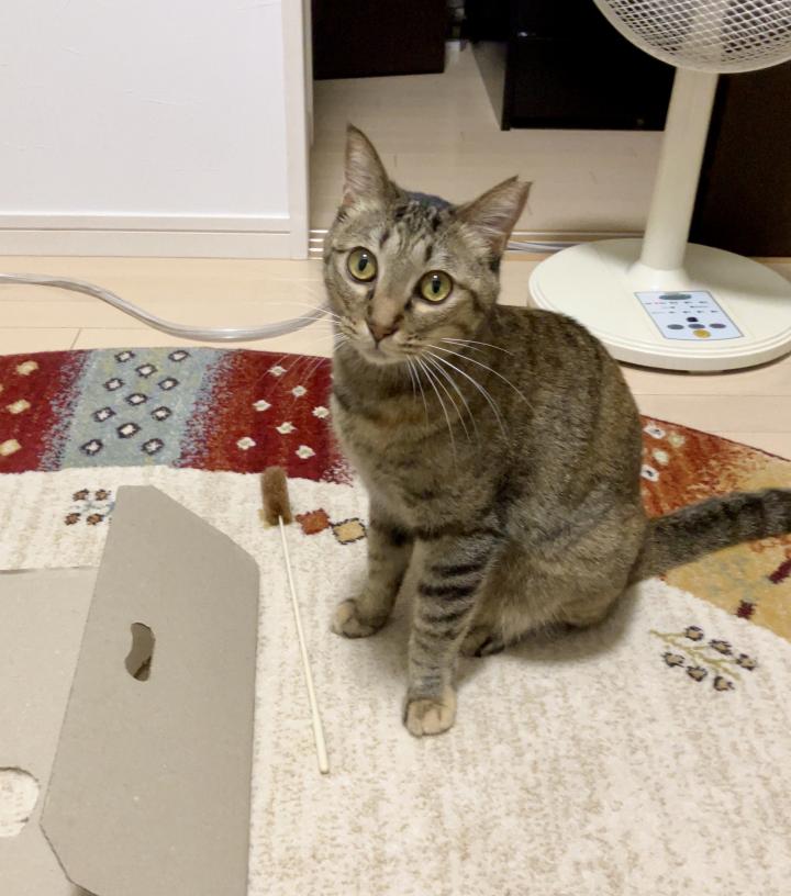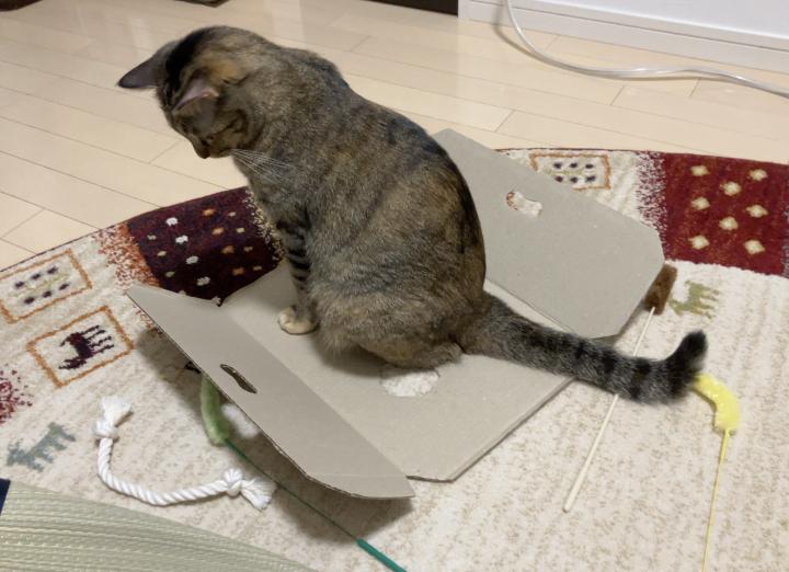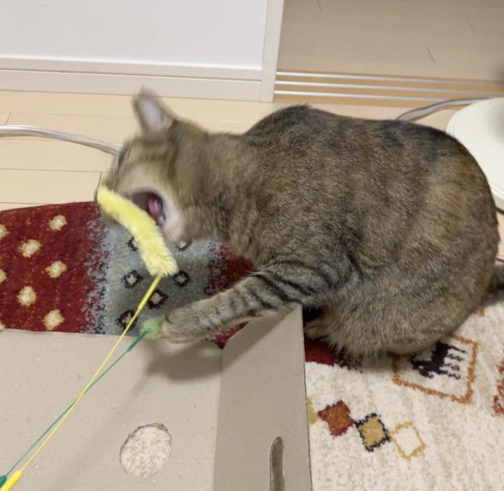 猫じゃらしを振ると、食いついて引き落として床に散らし、遮蔽物である段ボールも占拠します