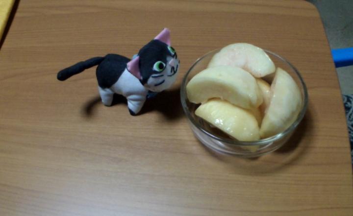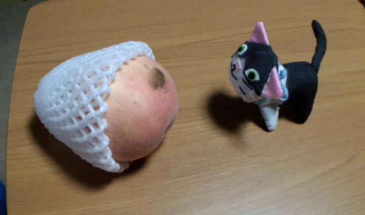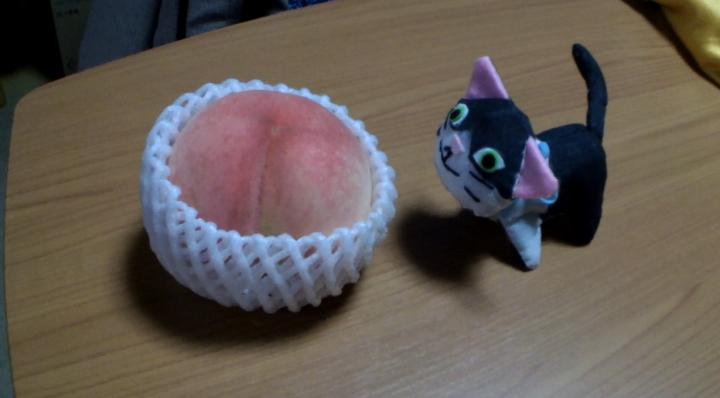 「おー、立派ニャ桃やニャ。高価かったやろ。」