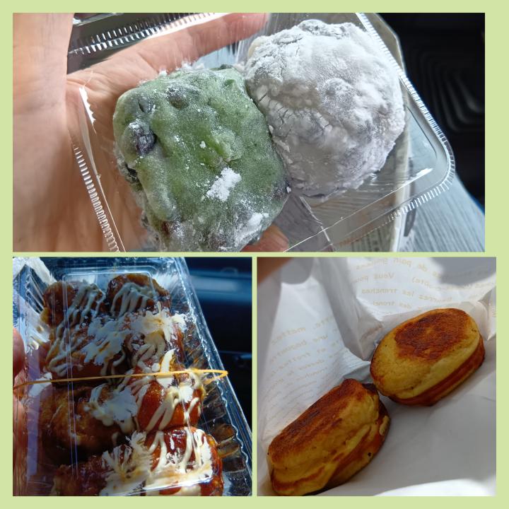 飛騨金山の朝採横丁で購入のたこ焼きと大判焼き(写真下左右)