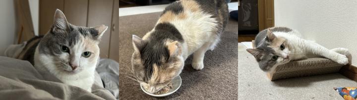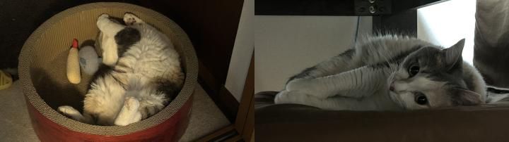 ●08/10(日) 週休朝食後に一緒に寝たり、お祝いのパウチ食べたり、爪研ぎでくつろいだり。