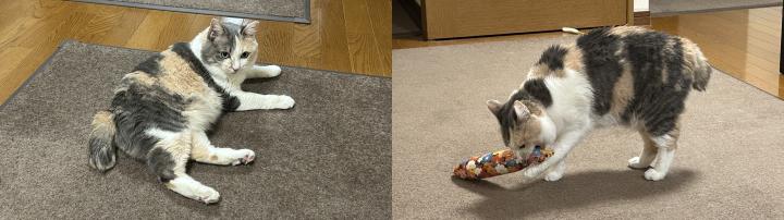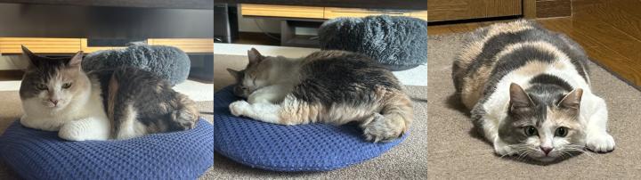 座布団でくつろいだり昼寝したり、じゃらしを狙ったり。