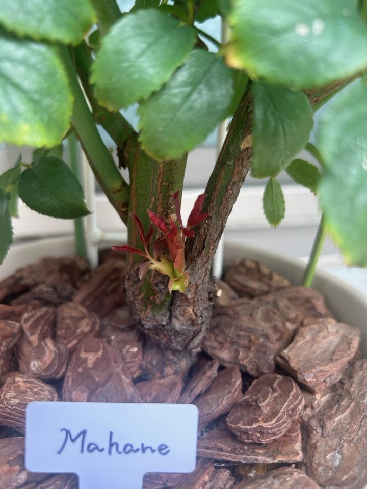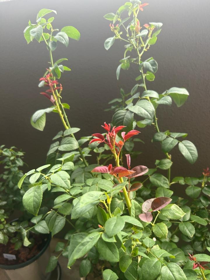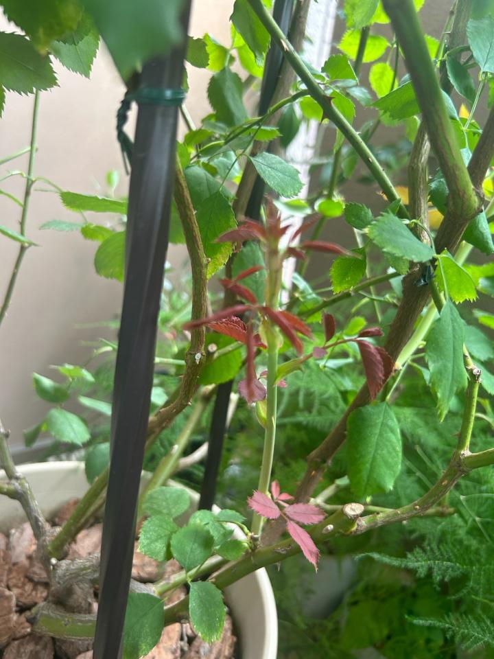 このところの雨でベランダのバラ達に新しいシュートが出始めました。
