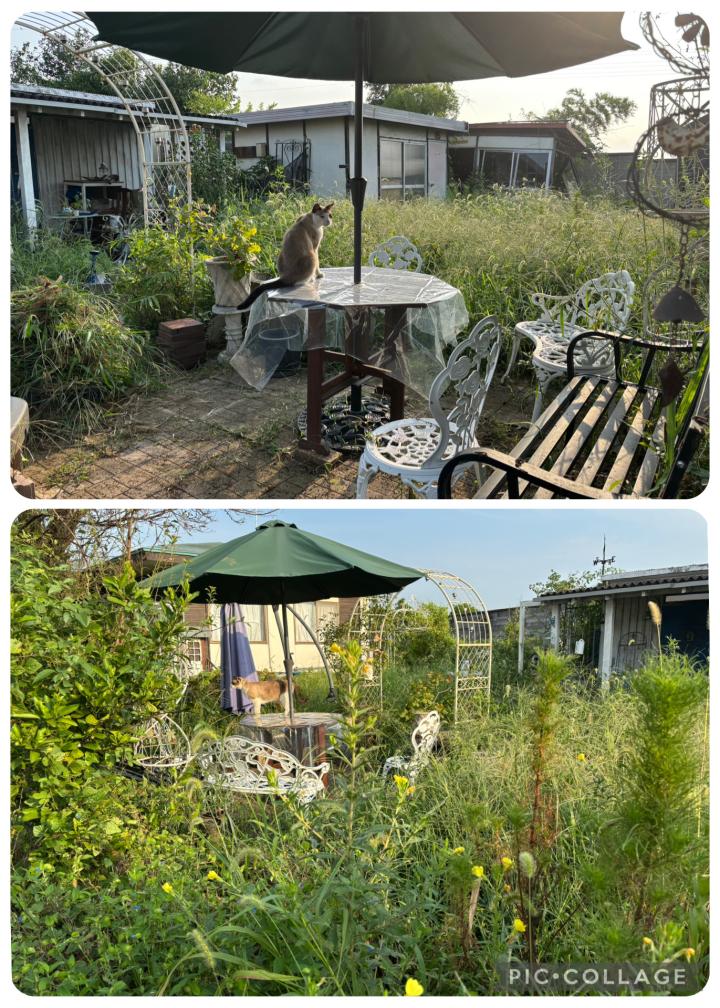 それでも玄関から車を止めてあるところまでの通路があまりにも草ぼうぼうなので、昨日の朝は5時に猫に起こされついでに1時間だけ草取りをやってみました。