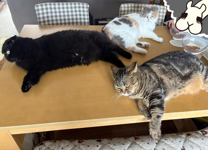 暑さは落ち着いたけれど、食卓テーブルで涼んでいるチームスコ…躾が悪くてお恥ずかしい😅