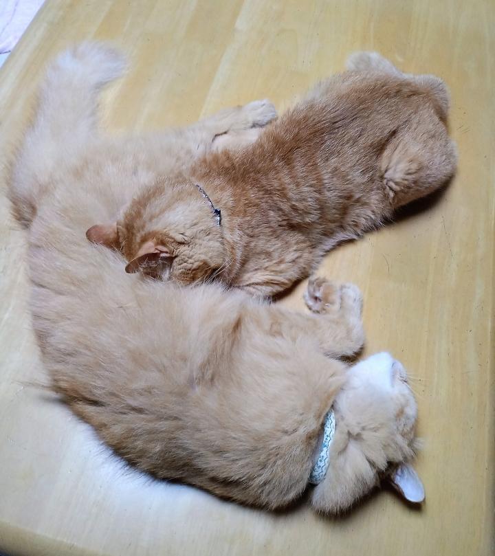 母猫化した茶太郎と子猫化したトラ