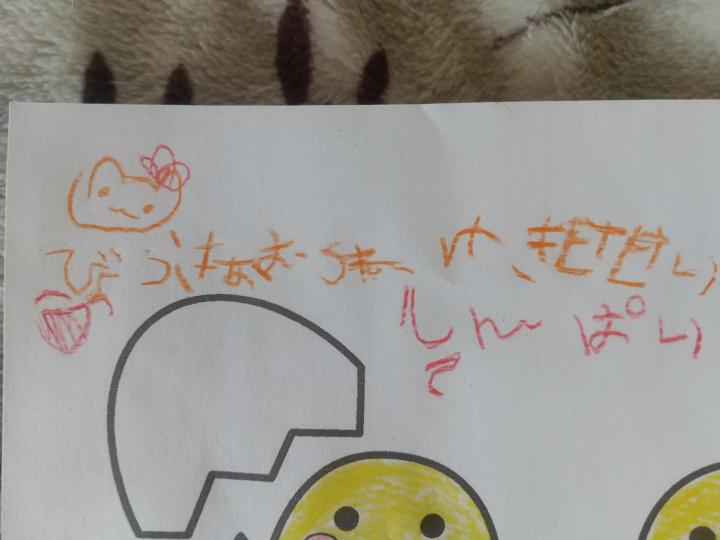 それで、木曜日の朝、年長組の女の子が「ゆき先生のおうちの猫ちゃん病気なんでしょ?」って聞いてきたので、“あれ?いつ話したかな?誰かと話してたのを聞いてたのかな?”と思いながら「そうなんだよ。お薬飲んだりして頑張ってるんだよ!」と答えたら、おもむろにぬり絵の紙に猫の絵と文字を書き始めました。