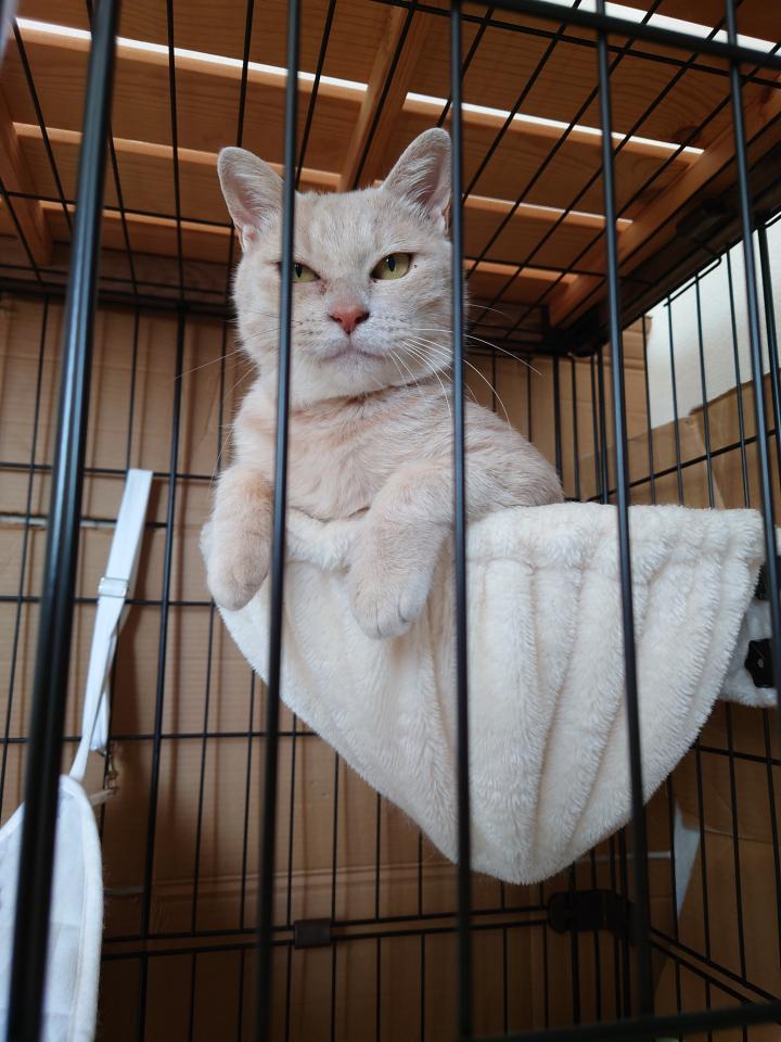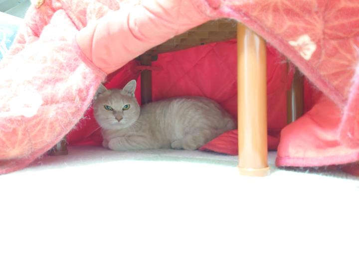 ケージ何時間かあけて少し部屋の中に出れる練習中。こたつは良い隠れ家