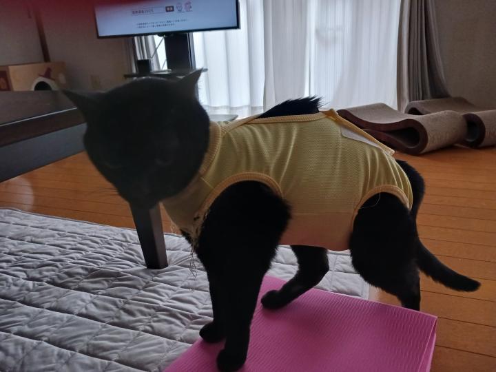 傷を舐め壊すといけないので、もう少しエリザベスウエアを着てもらいます。時々ブラシすると喜びます、痒いんでしょうかね。