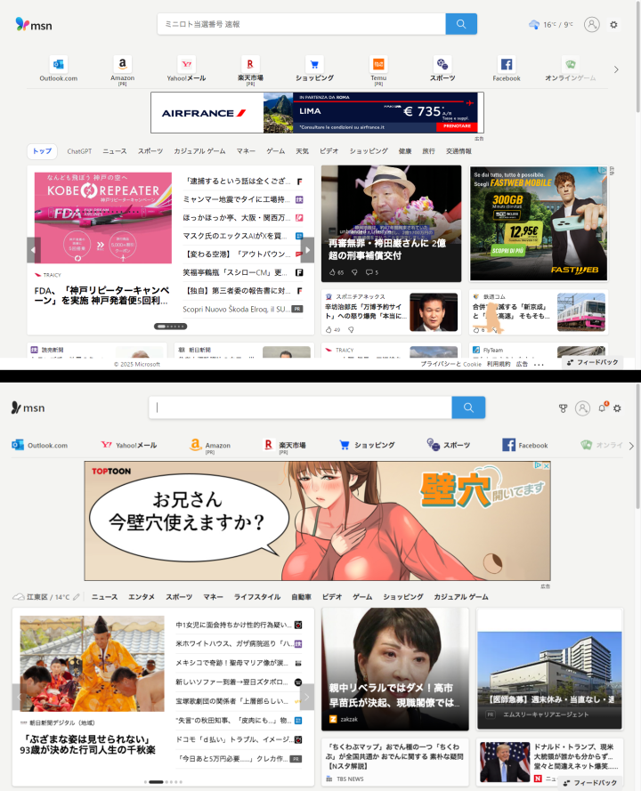 MSNのHP、上は通常のイタリアサーヴァー利用