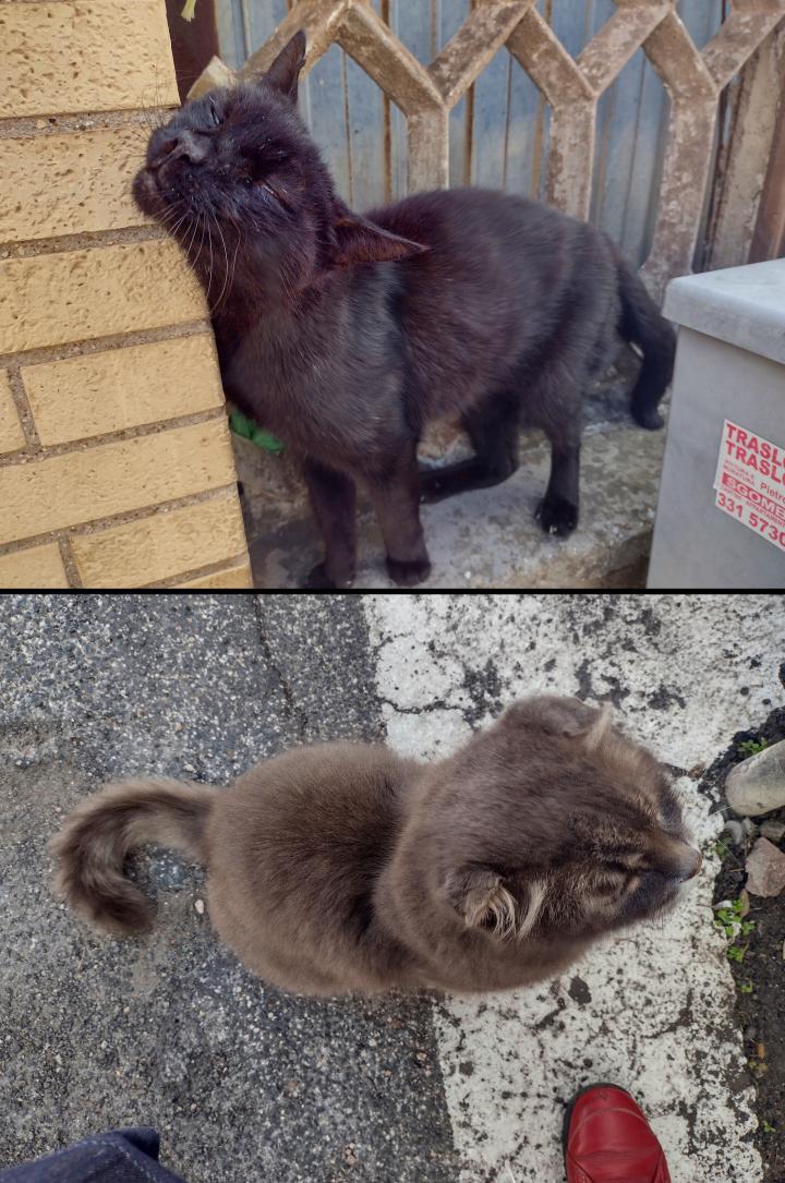 おそらく道路を挟んだ猫屋敷の子たち、餌で釣ったわけではないものの、2ニャンともスリスリ♡